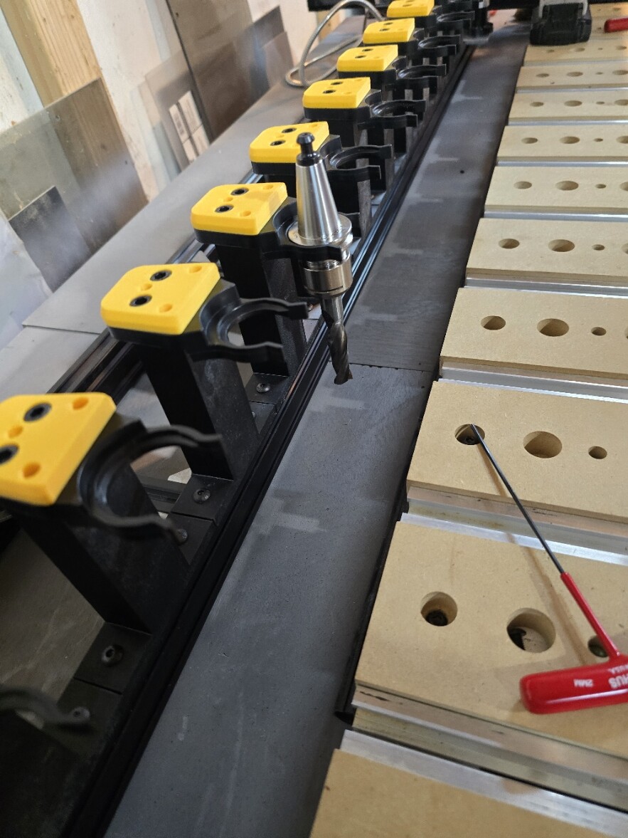 The machine Frame is not the Ideal candidate for an ATC, you will have to settle for some sort of offset of the bed in my case a 4x4. I am not doing sheet goods so the loss of work space VS not having to change tools by hand is a good compromise. Shapeoko’s Frane z heigh has only 6.1 inches of travel. So tool size is an issue and some sort of modification is necessary. Most people just remove one slat and a t track section. The onefinity would and is a better candidate But I do not own one. Using a vertical tool holder is not ideal and I went with the side mount holders.